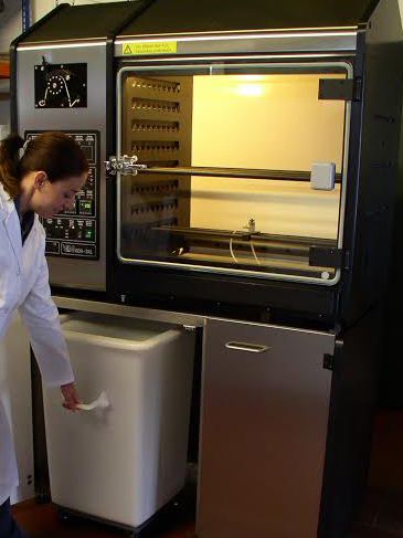 • Technologie permettant la meilleure reproductibilité possible des essais. Le fond de l’enceinte est en acier inox revêtu de Halar® (ECTFE) anticorrosion. Sous ce fond se trouvent des résistances plates permettant une chauffe bien plus uniforme et bien plus rapide de la chambre que dans les chambres à fond en fibre de verre ou similaire, avec des résistances immergées qui consomment beaucoup plus d’énergie pour des performances médiocres et rendent très complexe et coûteux un changement de résistance