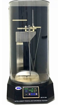 Pendule de dureté Persoz / Konig normalisé pour évaluer la dureté des revêtements selon König ou Persoz. Le test consiste à mesurer le temps d’amortissement d’un pendule oscillant sur une surface-test. L’amplitude d’oscillation du pendule, qui dépend de la dureté, est détectée grâce aux faisceaux photoélectriques du pendule. Elle décroît plus vite sur les surfaces souples.