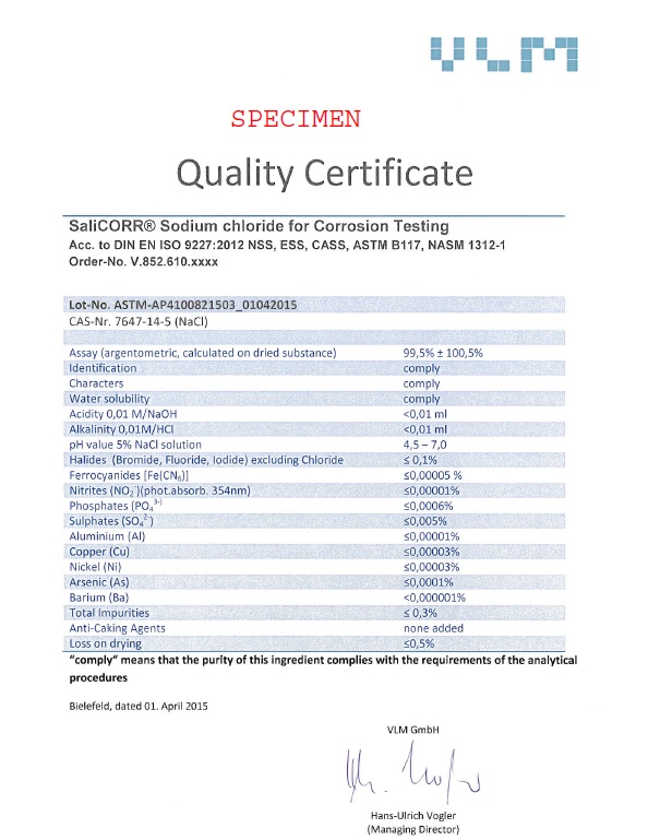 Sel pour brouillard salin (NaCl) / Chlorure de Sodium répondant aux normes ISO 9227 ou ASTM B117 ou ISO 6353-2. Nos sels répondent à ces normes et sont livrés avec certificat d’analyse et de conformité.