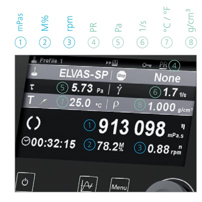 • Écran couleur, avec affichage de la viscosité, du couple, de la vitesse de rotation, du statut du programme, du stress et du taux de cisaillement, de la température et la densité du produit.